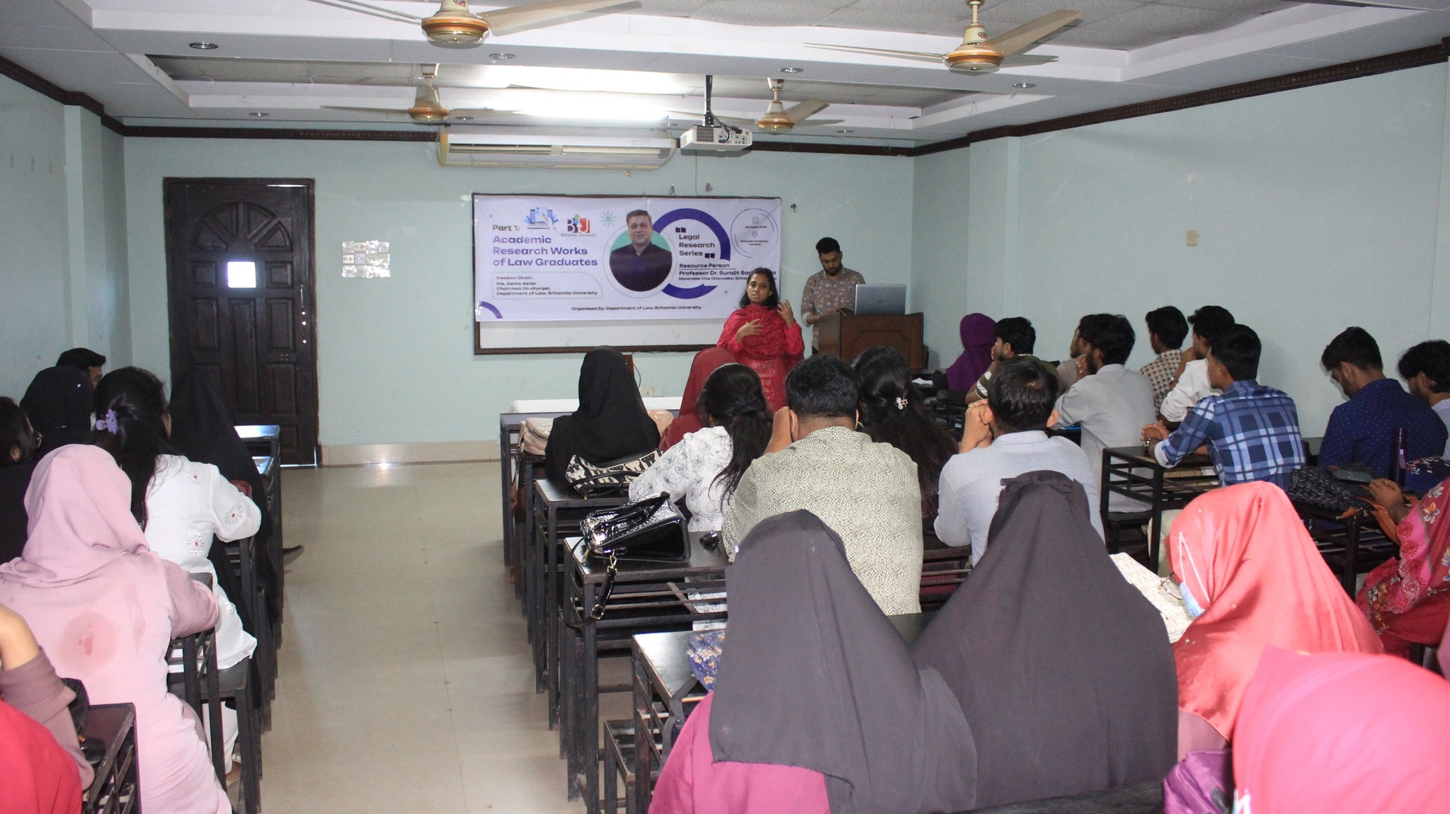 Mohammad Ismail Hossain, faculty member of the Dept of Law, BU in his opening speech welcomed students and set the tone for an interactive and engaging learning experience. Quazi Shah Paran, another Faculty member of the Department shared real-life insights and practical experiences in legal research. Asma Akter, Chair of the session explained effective methods for conducting academic research and writing scholarly papers which inspired students to approach research systematically and creatively.